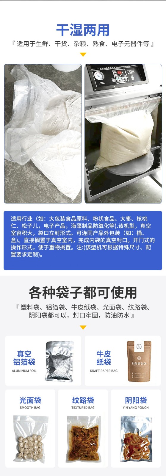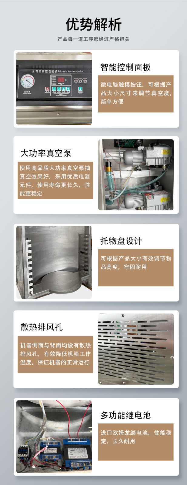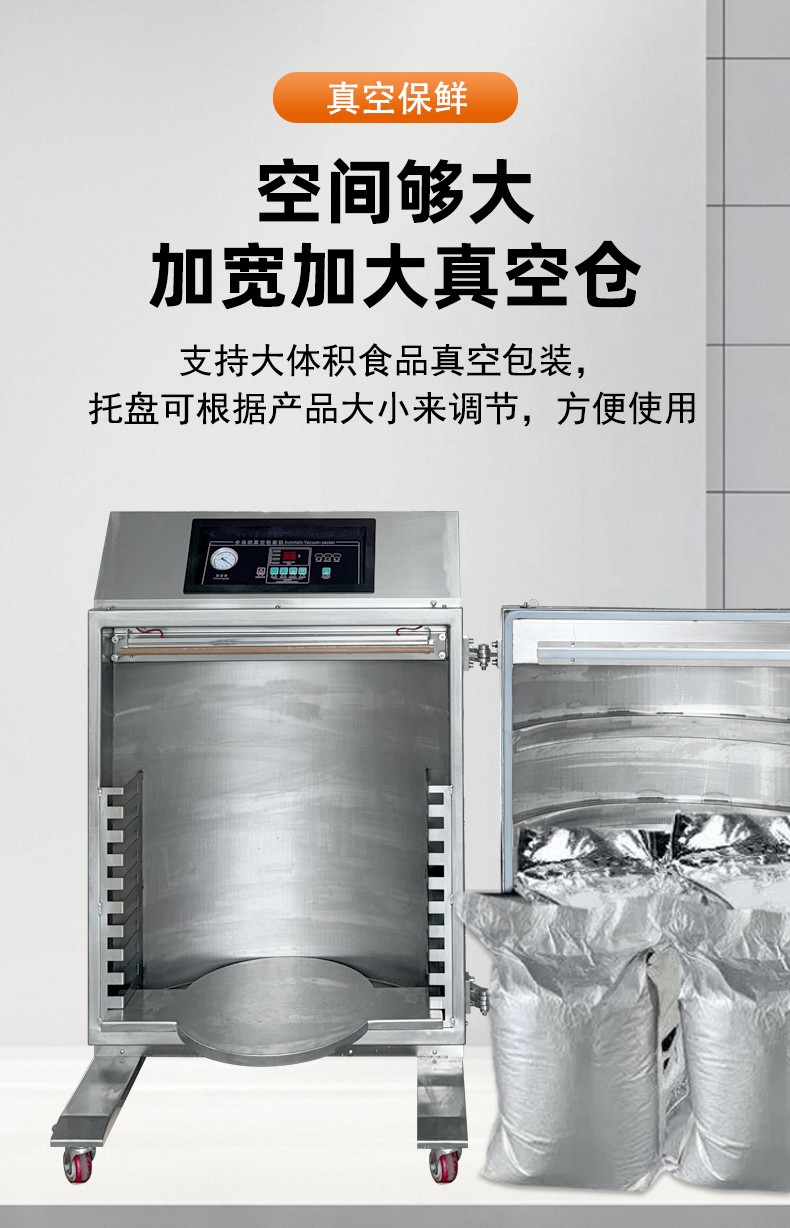 真空室:通常采用較大的腔體設計,多為豎立式,可容納大尺寸的包裝物品或多個小包裝同時進行包裝,部分還可將產品外包裝桶、紙箱等一起放入進行包裝。 封口裝置:一般為豎立式氣動封口,通過氣缸控制封口條,使包裝封口受力均勻,封口平直、美觀不起皺,封口尺寸多樣,常見的有 600mm、800mm 等。 控制系統:多采用 PLC 觸屏控制,可精確控制真空、加熱、冷卻時間,還能通過電接點真空表直接控制真空度,操作方便,穩定性強。 抽氣系統:配備高性能的真空泵,抽氣速度快,真空度高,部分機型還帶有過濾裝置,可防止粉末等雜質進
