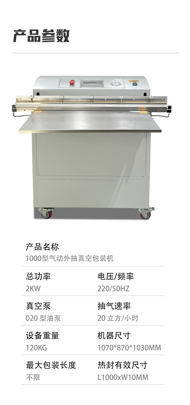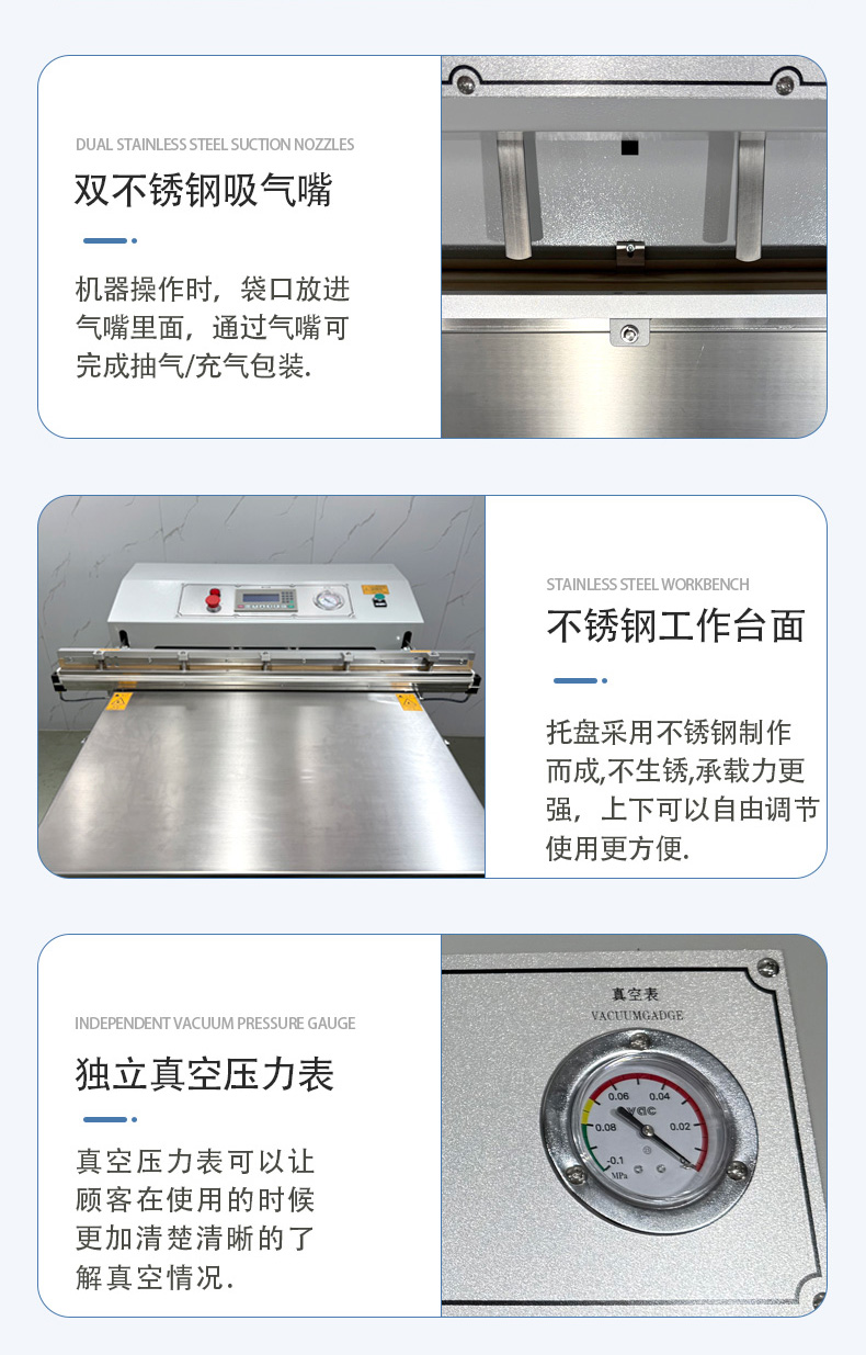 - 適配多場景:支持 PE、PA、鋁箔等多種包裝材料,可切換 “真空封口”“充氣保鮮” 兩種模式,兼顧工業(yè)防銹與食品保鮮需求。