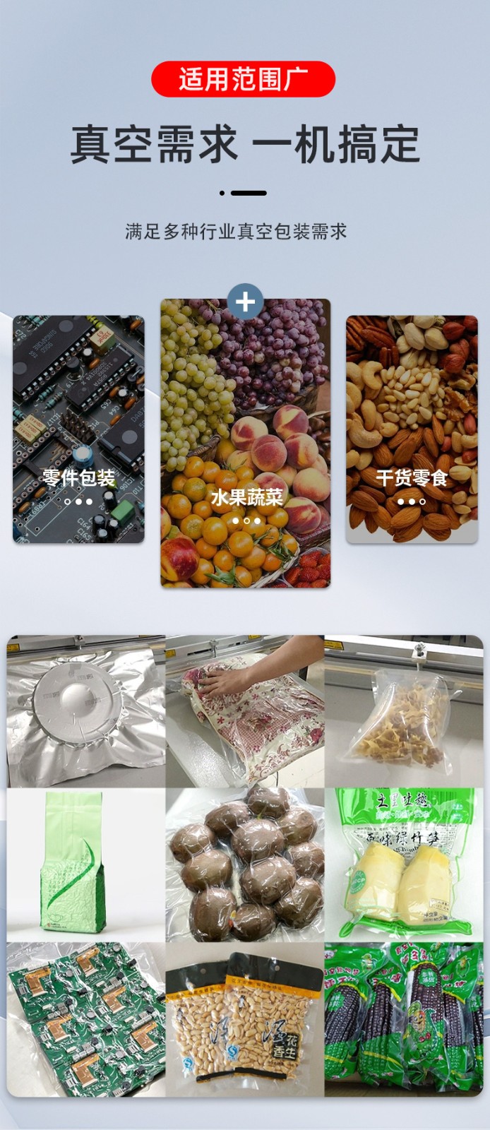 - 工業(yè)領(lǐng)域:大型機(jī)械零件、金屬構(gòu)件、整箱電子元件的真空包裝,防止運(yùn)輸中受潮、生銹。